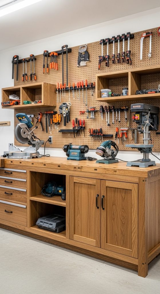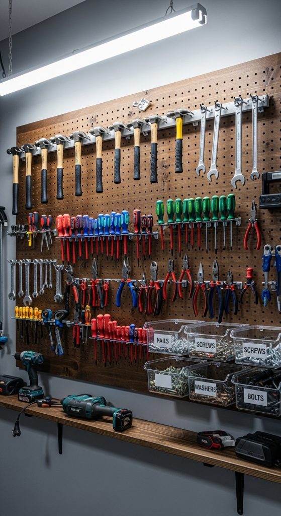 Pegboards are customizable—add small baskets or shelves to store nails, screws, and other hardware. For those who like a polished look, paint your pegboard in a bold color or frame it with wood trim for a finished appearance. This system ensures that everything has its place, making your garage resemble a professional workshop.