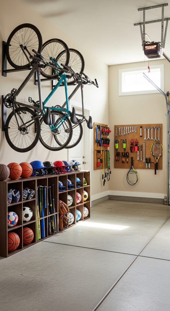 Bikes, skis, and sports gear often take up an enormous amount of garage space if not properly stored. Wall-mounted bike racks, ceiling hoists, or freestanding bike stands help reclaim valuable floor space.