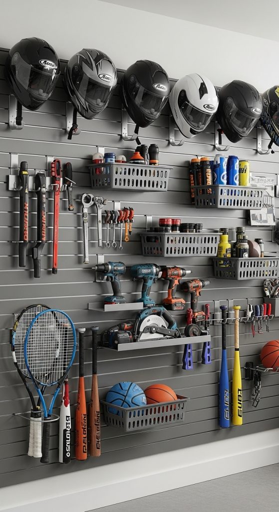 Slatwall panels are another efficient way to maximize wall storage. Unlike pegboards, slatwalls use horizontal grooves where hooks, baskets, and shelves can easily slide in. They’re sturdy, flexible, and capable of holding a variety of items like power tools, helmets, or sports equipment.
