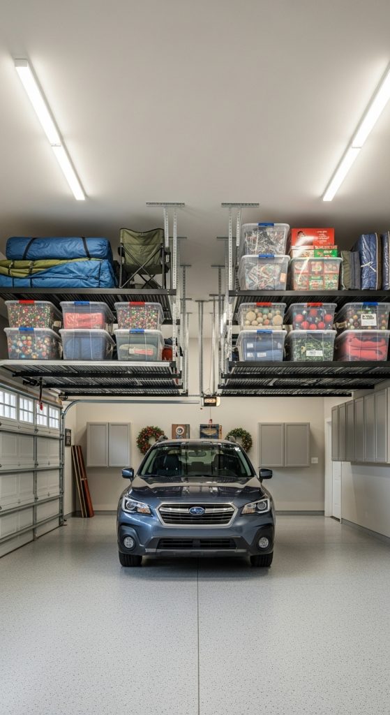 If you’re short on space, think vertically. Overhead racks utilize the unused ceiling area in your garage. These racks are perfect for storing seasonal items you don’t need every day—such as holiday decorations, camping gear, or seldom-used luggage.