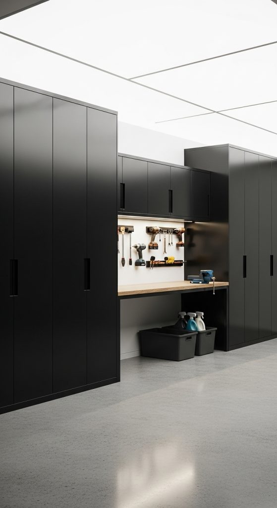 If you prefer a clean, minimalist look in your garage, multi-purpose cabinets with doors are the way to go. Unlike open shelving, cabinets hide clutter, creating a more polished appearance.