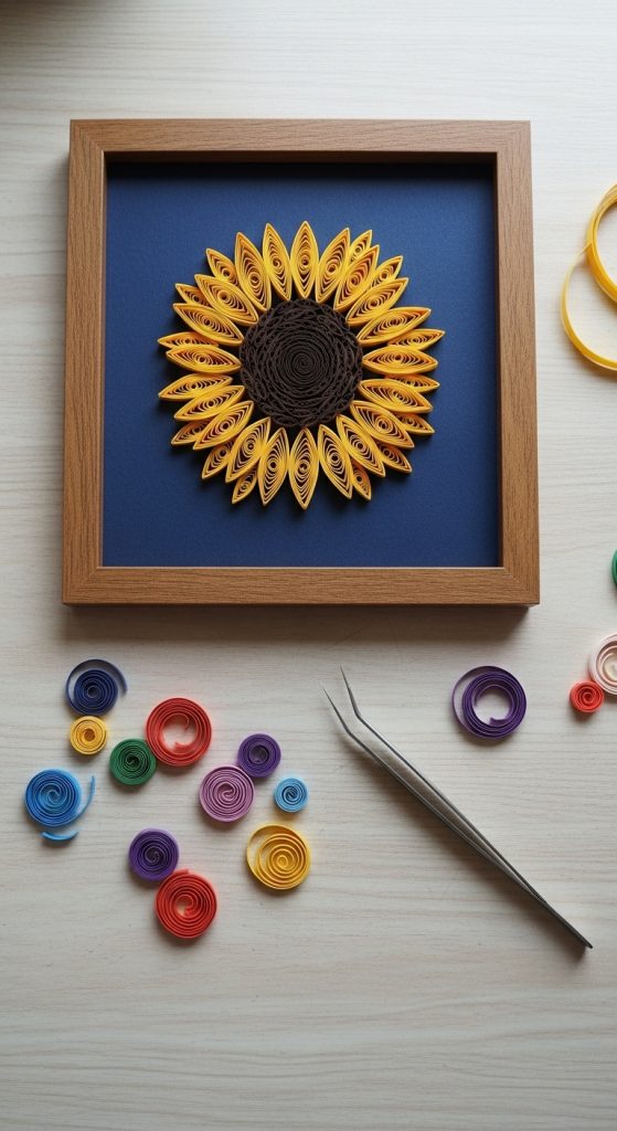 Roll colored paper strips into coils using a quilling tool. Shape into flowers, animals, or abstract patterns. Glue onto canvas backgrounds. Frame under glass for protection. Perfect for nursery decor or office gifts.