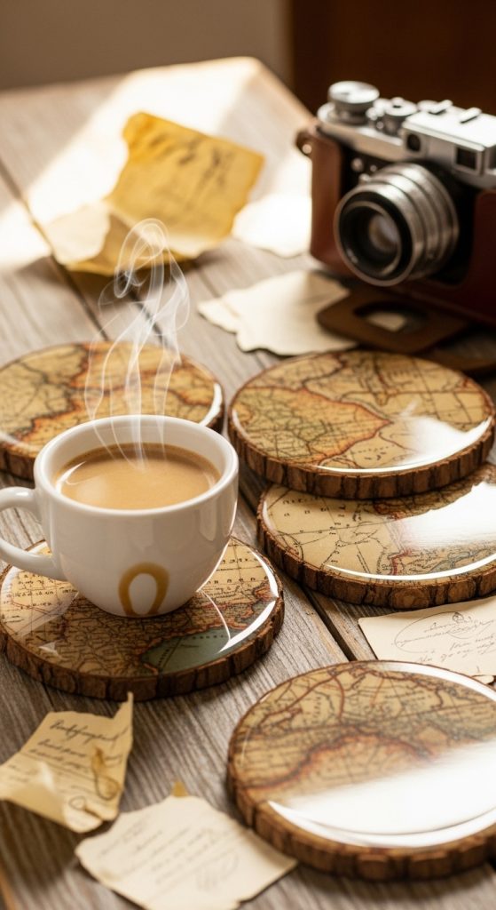 Cut circular wood slices or cork bases. Mod podge printed photos or maps onto surfaces. Seal with 4-5 waterproof resin layers. Felt pads prevent table scratches. Ideal for preserving travel memories or family portraits.