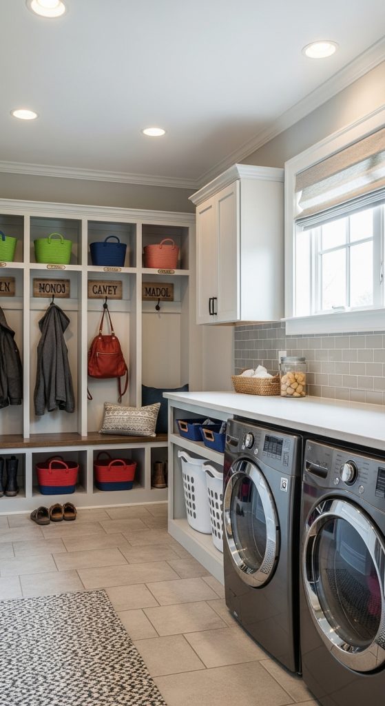 Combining the laundry room with a mudroom is a practical choice for families. This design integrates storage for coats, shoes, and bags with laundry appliances.