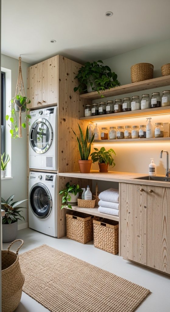 Front-loading machines can be placed under butcher-block countertops, offering space for folding. Woven baskets and glass jars create stylish storage while maintaining functionality. Add a small potted plant or hanging greenery to bring a fresh natural touch to the room.