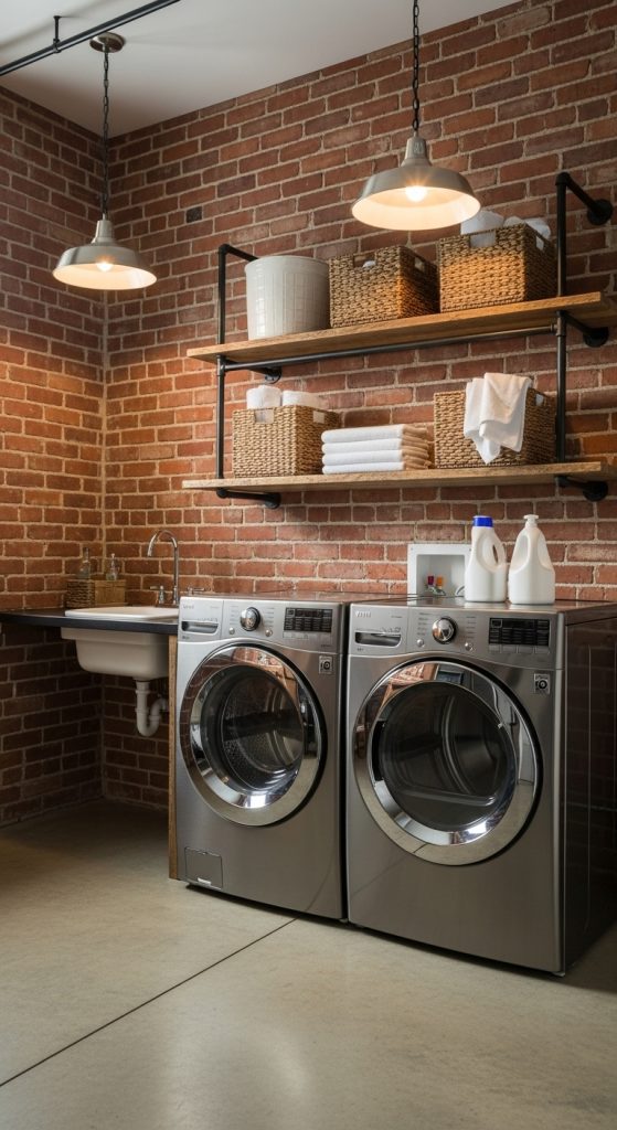 For a bold and edgy look, an industrial-inspired laundry room is the way to go. This design features raw, utilitarian materials like exposed brick, concrete, and metal.