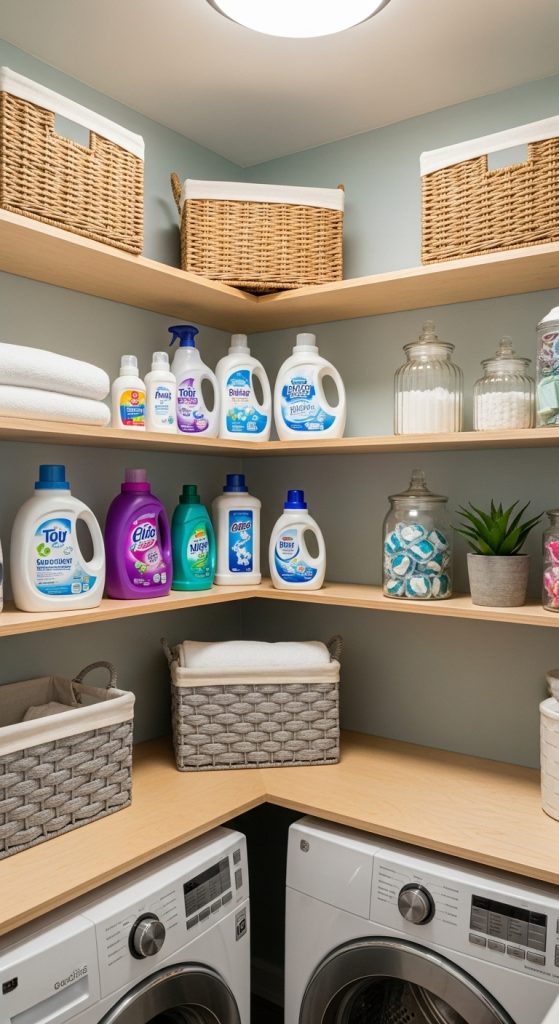 Corners in laundry rooms often go unused, but installing corner shelving can turn that wasted space into valuable storage. Corner shelves can hold everyday laundry supplies or decorative accents that add warmth to the room.
