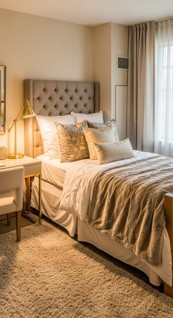 A luxury dorm room can be achieved with soft neutral tones like beige, cream, and taupe layered with rich textures. Choose plush bedding with faux fur throws, linen sheets, and decorative pillows to bring in sophistication. A tufted headboard instantly elevates the look, while gold or brass desk accessories add a subtle touch of glam. Incorporating storage ottomans in neutral shades not only keeps the room organized but also stylish. Add sheer curtains for a light, airy vibe that still feels polished. This design makes even the smallest dorm room feel upscale, serene, and timeless.