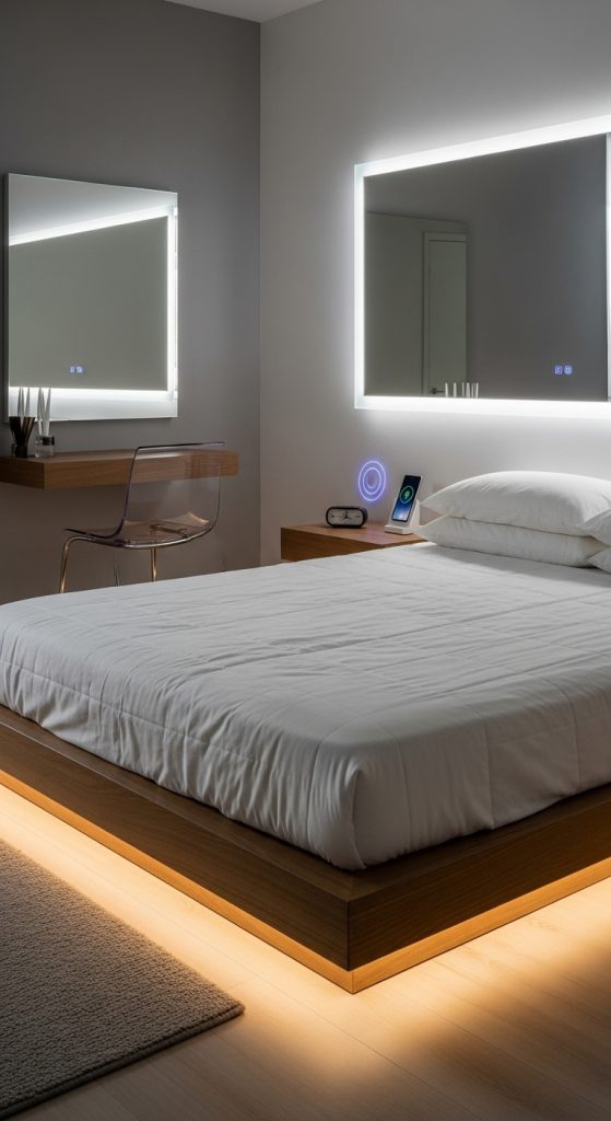 For students who love modern conveniences, a tech-inspired luxury dorm is the way to go. Invest in smart LED lighting that changes colors to match your mood. Pair this with sleek modern furniture, like a platform bed and acrylic desk chair. Choose high-thread-count sheets and a minimalist quilt for understated elegance. Add wireless charging stations, a Bluetooth speaker, and hidden cable organizers for a clean, streamlined look. An oversized mirror with built-in lighting doubles as both a vanity and décor. This style blends innovation with sophistication, giving your dorm a futuristic yet stylish high-end vibe.