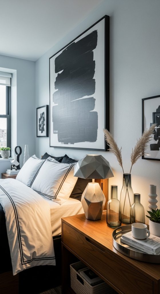 For a bold and luxurious dorm aesthetic, center your design around statement art. Choose oversized canvas prints or framed photography to hang above the bed. Pair this with high-quality bedding in a monochrome palette, allowing the art to shine. Introduce sculptural lighting like a geometric lamp or gold arc floor lamp to tie in the theme. Accent with glass vases, marble coasters, or metallic trays on the desk for a refined touch. This design is perfect for students who want their dorm room to reflect creativity and personality while still maintaining a high-end, stylish atmosphere.