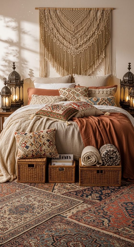 A luxury dorm room can also have a bohemian touch when styled thoughtfully. Opt for layered rugs, including Persian-inspired prints, paired with luxe bedding in soft, earthy tones. Add macramé wall hangings but elevate them with metallic frames or beaded details. Use velvet or embroidered throw pillows to introduce texture and richness. Hanging lanterns or Moroccan-style lamps bring warmth and luxury to the boho vibe. Storage baskets in natural materials like wicker or rattan keep the room functional while still stylish. This fusion creates a unique dorm room that feels artistic, cozy, and elegantly free-spirited.