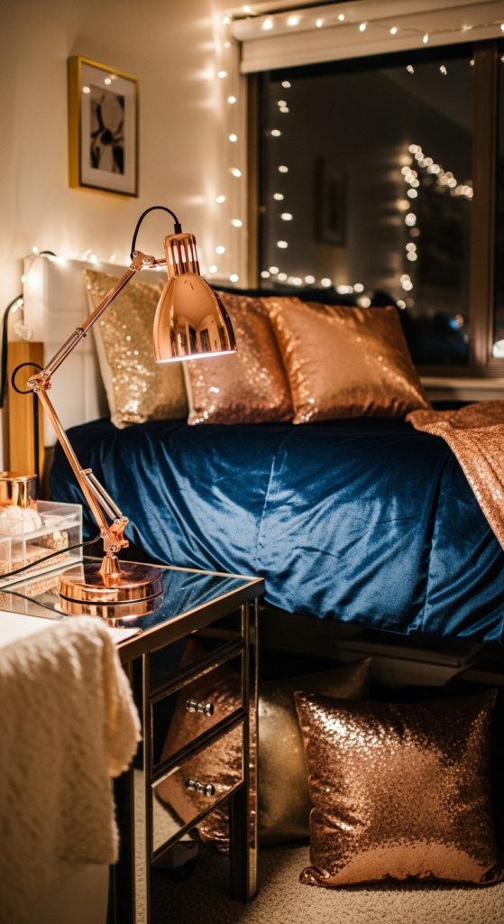 For a luxe dorm upgrade, metallic details can transform your space into something dazzling. Think gold or rose gold desk lamps, silver-framed mirrors, and shimmering throw pillows. A metallic bar cart used as a nightstand can double as stylish storage. Complement this with velvet bedding in rich jewel tones like emerald or navy to contrast the shine. String fairy lights or add a crystal chandelier-style pendant to enhance the glam vibe. This style captures both sparkle and elegance, making your dorm room feel more like a high-end apartment rather than a student space.