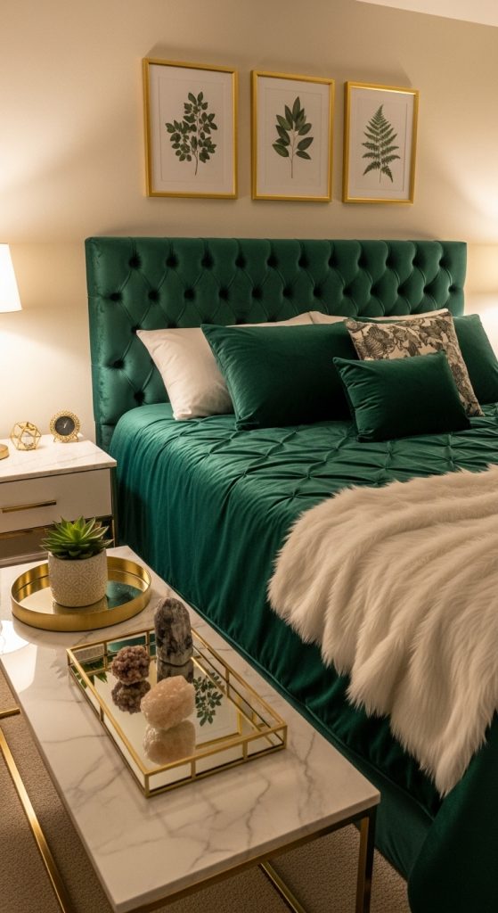 Velvet instantly signals luxury, making it a perfect dorm room upgrade. Opt for a velvet comforter or bedspread in deep shades like sapphire blue, rich burgundy, or emerald green. Add a tufted velvet headboard to complete the opulent look. Accent with gold-framed wall art and decorative trays to keep accessories organized in style. Pair with a faux fur throw draped over the bed or desk chair for an extra layer of comfort. This combination of textures transforms a small dorm space into a room that feels both glamorous and inviting, creating a luxe retreat for downtime.