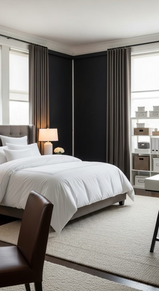 Transform your dorm into a five-star suite by mimicking hotel design elements. Choose crisp white bedding with a tailored duvet, accented by a sleek upholstered headboard. Incorporate blackout curtains for restful sleep, and add a plush rug underfoot for a cozy yet refined touch. A matching set of lamps on each side of the bed adds symmetry and polish, while a chic leather chair at your desk elevates function with style. Keep clutter hidden in elegant storage boxes. The overall result is a room that feels polished, luxurious, and comfortable — perfect for productive study and relaxation.