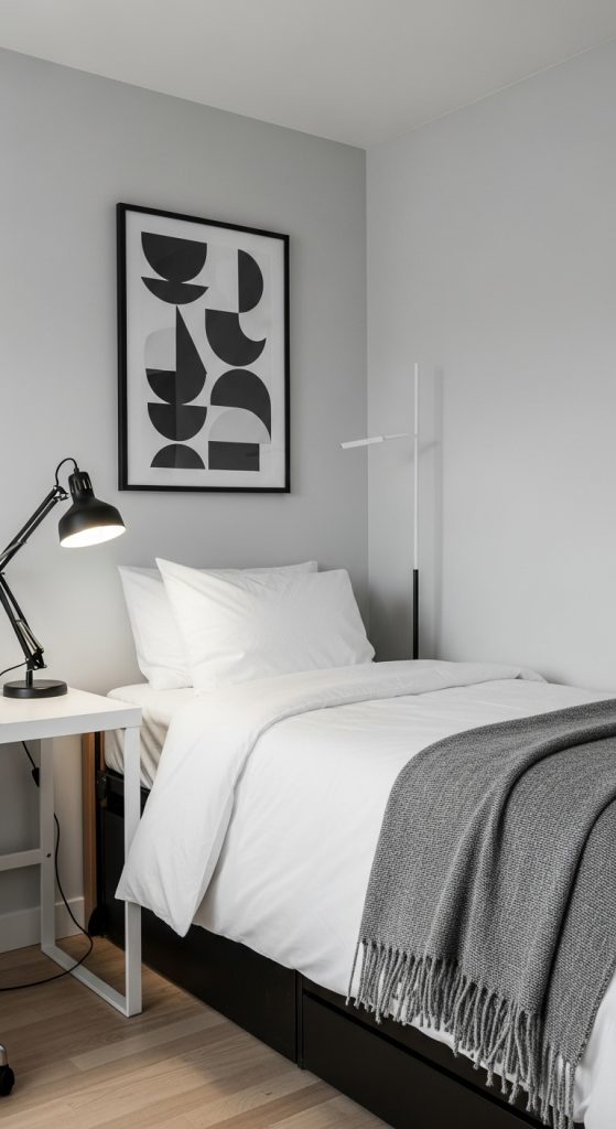 Luxury doesn’t always mean opulent; sometimes it’s about simplicity done right. A minimalist dorm room designed with clean lines and high-quality materials can feel elevated. Invest in crisp white bedding paired with a sleek gray throw and structured pillows. A monochrome color palette with pops of matte black accessories creates sophistication. Add modern lighting such as a slim floor lamp or pendant light. Keep surfaces clutter-free by using hidden storage. A carefully selected piece of abstract wall art provides character without overwhelming the space. This minimalist approach offers a serene, high-end environment for both focus and rest.