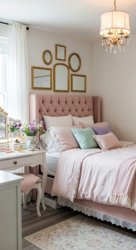 A Parisian-inspired dorm room exudes sophistication with romantic flair. Choose a wrought-iron bed frame or tufted upholstered headboard as the centerpiece. Crisp white bedding with lace or ruffle accents sets the tone, while gold-framed mirrors and ornate picture frames add elegance. Accent with a soft pastel palette — blush, lavender, or powder blue. A chandelier-style light fixture or vintage-style lamp enhances the charm. Incorporate a small vanity desk with a stylish chair for a luxe touch. This style combines femininity with classic European sophistication, turning a standard dorm room into a chic escape reminiscent of a Paris apartment.