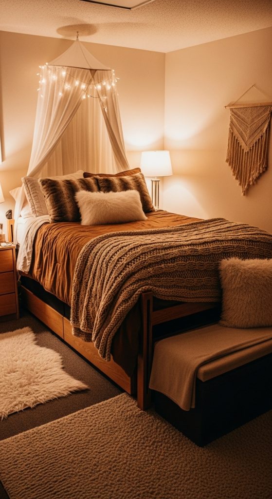 For students who want comfort as much as elegance, a cozy luxury dorm room is the perfect balance. Choose oversized knit blankets, faux fur pillows, and a thick area rug for a layered look. Neutral or warm tones like cream, caramel, and soft grays create an inviting environment. Add string lights or warm-toned fairy lights behind a canopy for ambient lighting. A fabric-upholstered storage bench at the foot of the bed enhances both style and function. This look emphasizes relaxation, making your dorm feel like a private haven while still maintaining upscale details through texture and quality.
