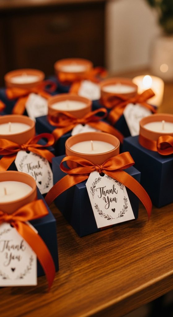 6. Terracotta Wedding Favors with Navy Blue Packaging