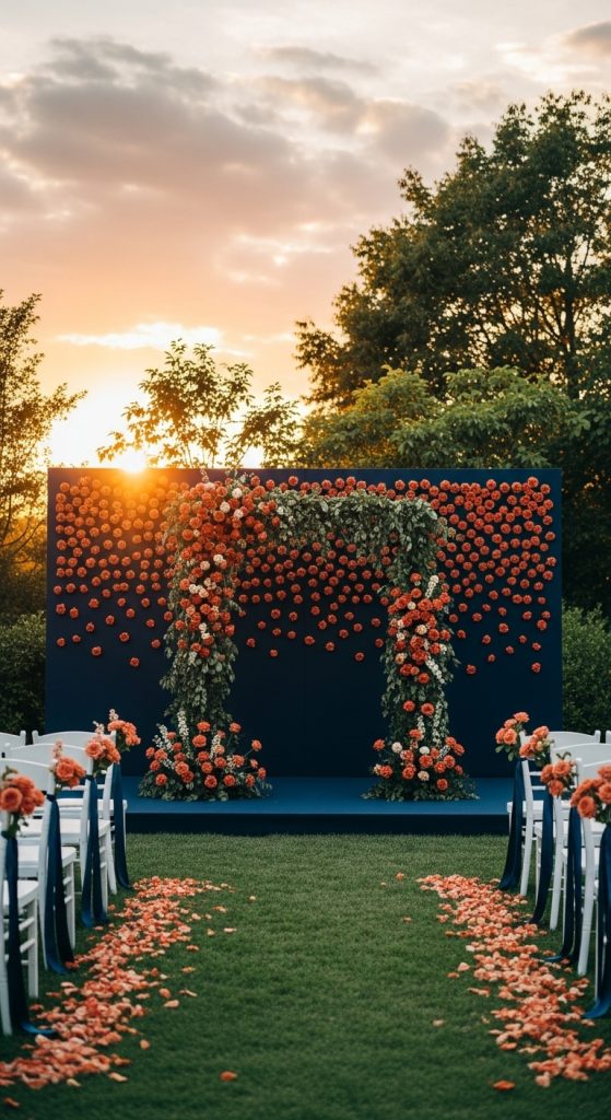 - Use a navy blue backdrop with terracotta floral arrangements for the altar or behind the wedding party.