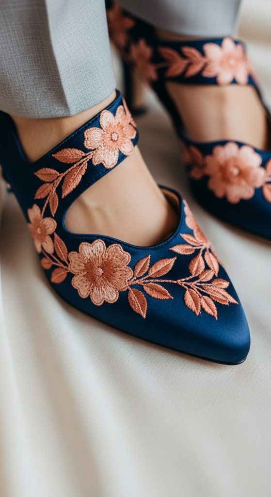- Choose navy blue or terracotta shoes with elegant details, like lace or satin finishes, to complement your wedding attire.