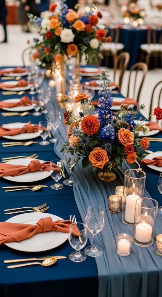Your wedding reception table settings are an essential part of the overall atmosphere, and navy blue and terracotta are perfect for creating a warm, elegant vibe. From table runners to napkins and place cards, these colors can be incorporated in subtle ways that create a cohesive, stylish look.