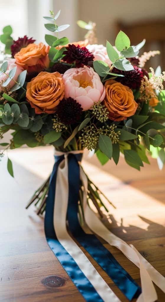 - Create a stunning wedding bouquet that combines these colors, with terracotta roses and navy blue accents woven through the greenery.