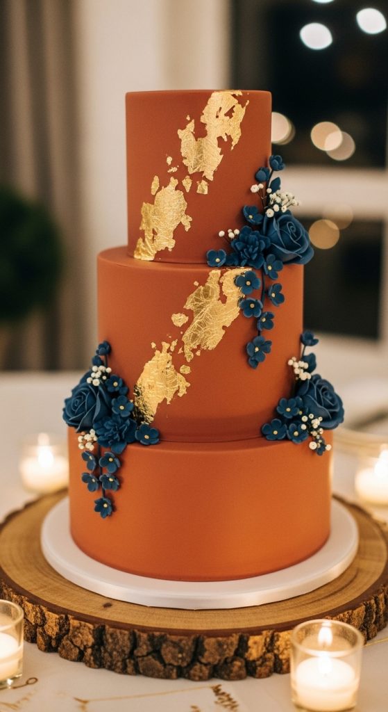 - Choose a tiered cake with alternating navy and terracotta layers for a dramatic effect.