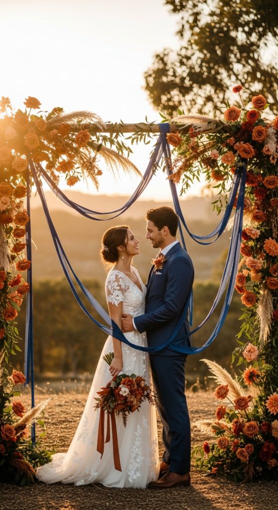 These colors create a romantic, earthy atmosphere for your wedding ceremony. The deep, rich tones of navy blue combined with the warmth of terracotta bring a sense of elegance and tranquility to your special moment.