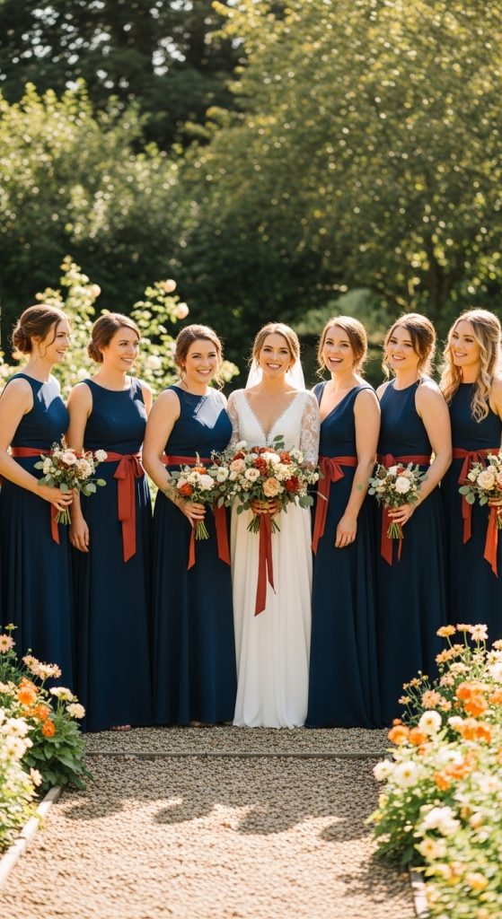 Navy blue dresses are timeless and elegant, while terracotta accents add warmth and personality to the bridal party. This combination creates a stunning contrast without overpowering the bride’s gown and ensures the bridesmaids stand out beautifully.