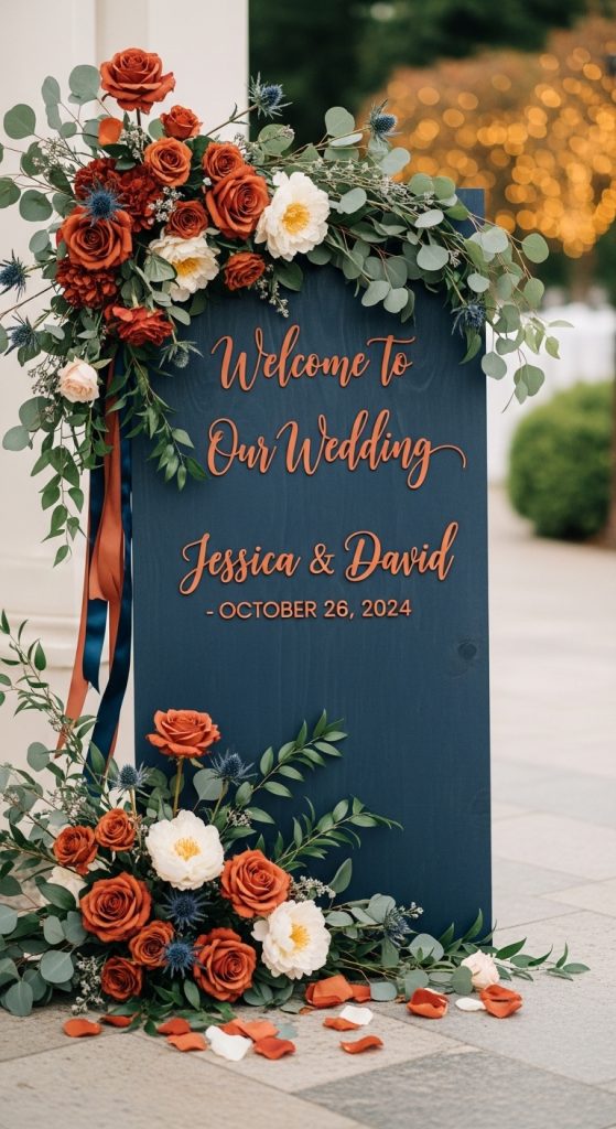 8. Terracotta and Navy Blue Wedding Signage