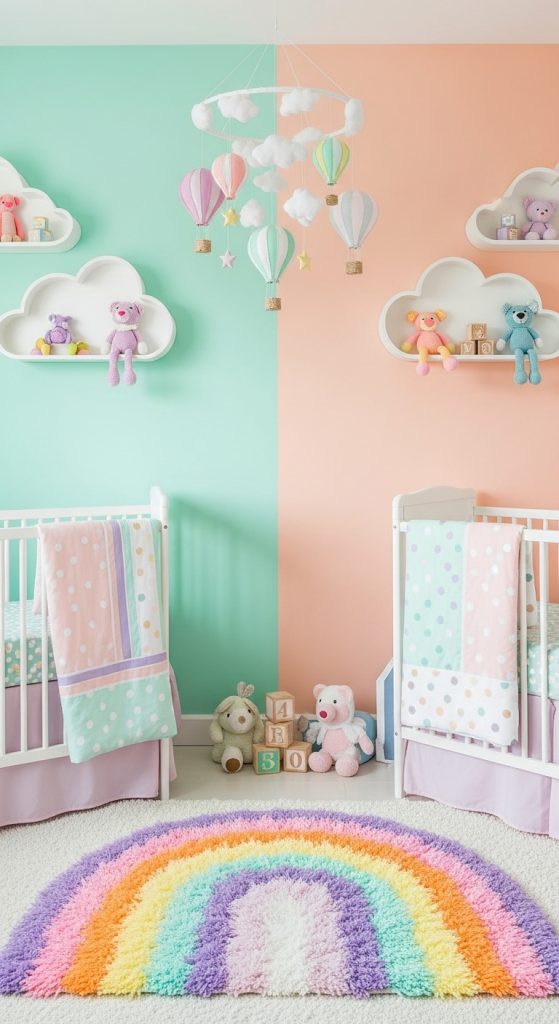 Furniture in white or natural wood tones balances the palette. Add whimsical accessories like cloud-shaped shelves, rainbow rugs, and pastel mobiles. This theme feels lighthearted, imaginative, and fun—perfect for creating a happy, stimulating environment.