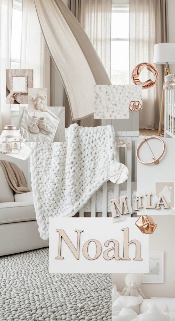 Gold or rose gold accents add warmth and femininity without overwhelming the space. Personalized touches like a wooden name sign above the crib or monogrammed pillows bring individuality. This idea is timeless, versatile, and can easily grow with your child.
