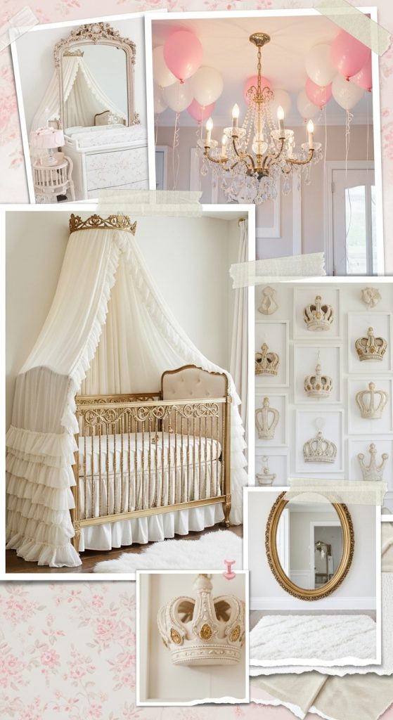 If you want to indulge in a royal theme, a princess-inspired nursery is the way to go. Use a soft pastel palette—pinks, purples, and creams—with gold accents throughout the room. A crib with ornate details or a canopy draped in tulle creates a regal touch.