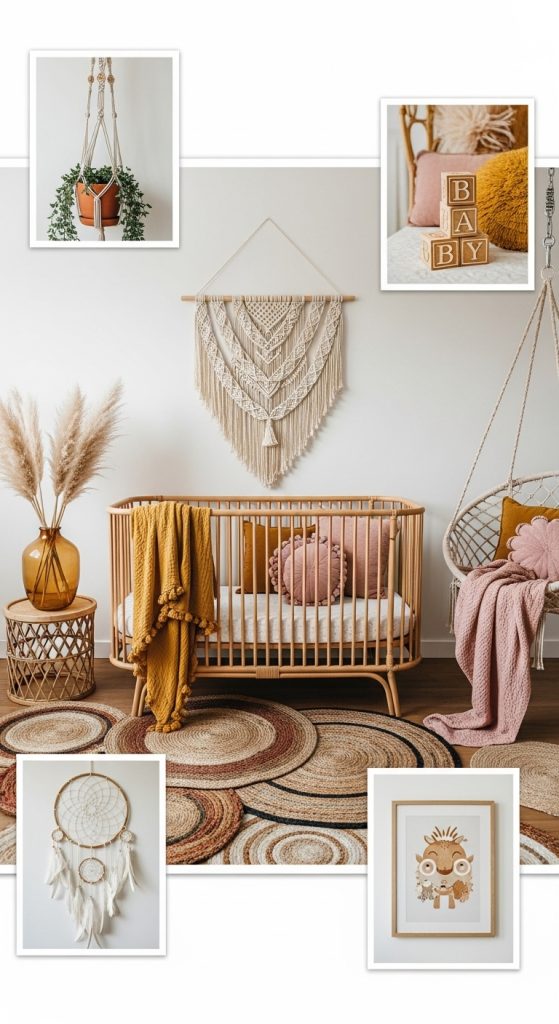 A boho nursery combines earthy tones, natural textures, and whimsical accents. Think macramé wall hangings, rattan furniture, and warm color palettes with terracotta, mustard, and blush pink. Add layers with woven rugs, textured blankets, and baskets for storage.