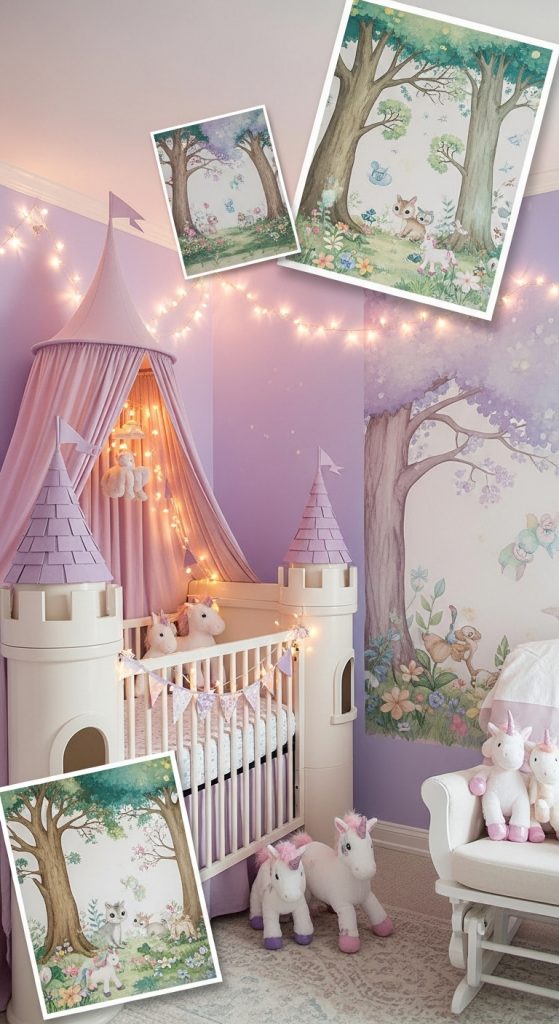 Transform your nursery into a storybook dream with a fairy-tale theme. Think enchanted forest murals, twinkling fairy lights, and a crib canopy that mimics a castle turret. Pastel purples, pinks, and soft greens make the space feel magical, while fairy or unicorn decals add a whimsical flair.