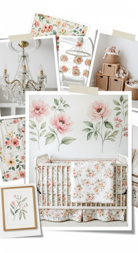 You can mix florals in subtle ways, such as floral-patterned curtains, throw pillows, or crib skirts. A crystal chandelier or light fixture with petal-like details adds glamour. To keep it grounded, add natural elements like rattan baskets or wooden shelves. This style creates a cheerful, garden-like nursery that feels fresh and vibrant.