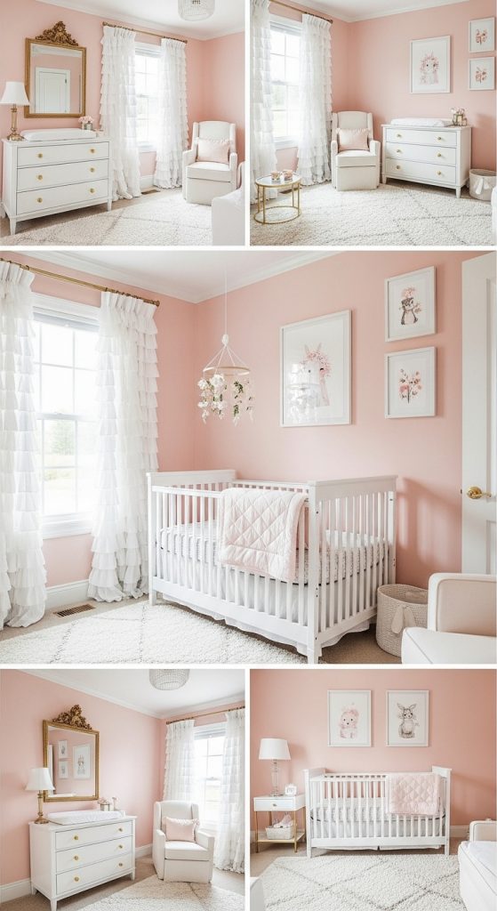 Pink has always been a timeless choice for girls’ nurseries. A soft blush or dusty rose color palette creates a gentle, soothing environment. Pair pastel pink walls with white or cream furniture for a classic look. Add delicate touches like ruffled curtains, floral crib sheets, and a tufted glider chair for an elegant finish.
