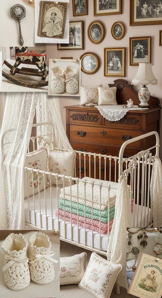 Vintage nurseries blend nostalgia with warmth. Choose antique-style furniture like an iron crib or a distressed wood dresser. Soft pastels paired with lace curtains and crocheted blankets give the room a timeless feel.