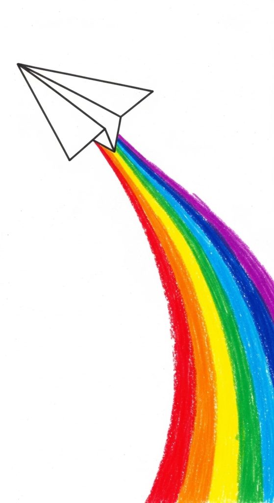 Color can dramatically change the mood of a drawing. Instead of plain motion lines, draw a rainbow-colored trail behind the paper airplane. The rainbow can flow in wavy patterns, filling the page with brightness and joy.