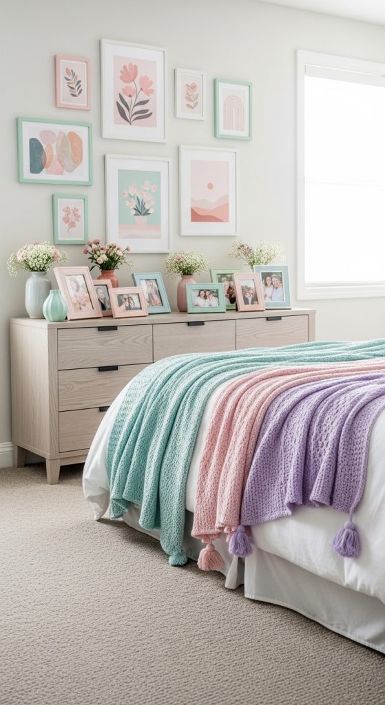 - Personalized Artwork: Frame personal photographs or handmade art in pastel-colored frames to give the room a personal, homely touch.
