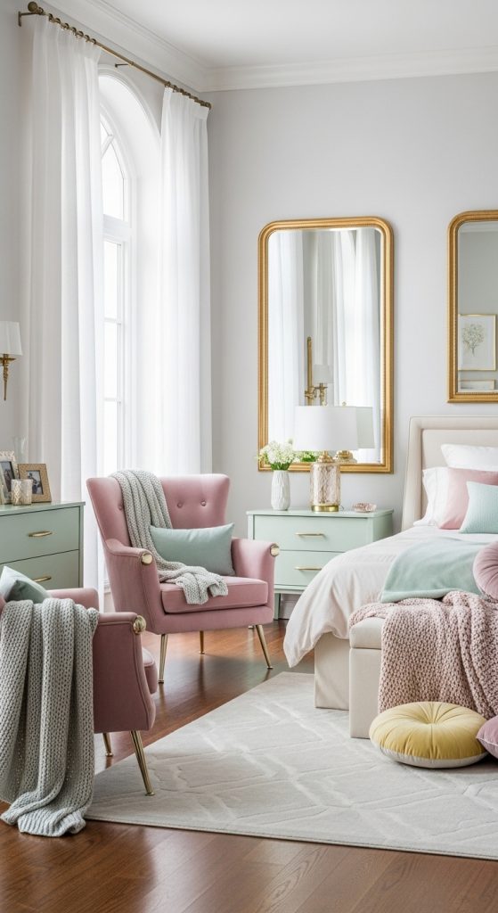 - Soft Upholstered Chairs: A pastel-colored armchair or vanity stool with delicate upholstery adds comfort and style to your room.