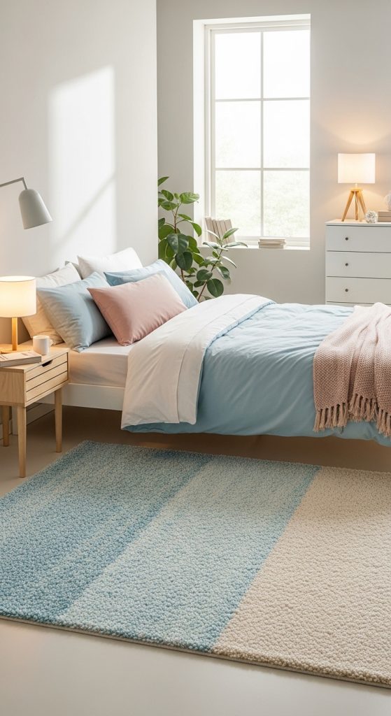 Why It Works: Pastel rugs not only provide warmth and comfort but also enhance the overall aesthetic of the room. Their soft hues complement your bedding, walls, and furniture, bringing everything together into a cohesive design.