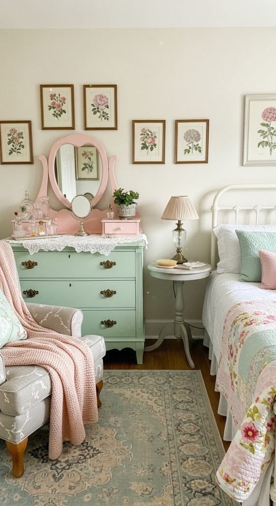 Why It Works: Vintage furniture in pastel tones creates a charming, nostalgic atmosphere, blending seamlessly with modern accents and adding a touch of character to your room.