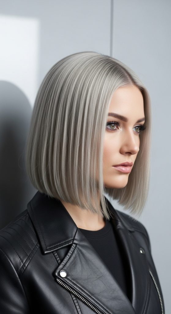 A silver blonde bob embodies Scandinavian minimalism with an edgy, modern twist. This haircut typically falls between the chin and shoulders, creating a sharp, clean silhouette. Silver blonde hair is cool-toned, often requiring bleaching followed by a silver or lavender toner to achieve a reflective metallic finish. This style works well with straight or slightly wavy textures, emphasizing the bob’s sleek lines. It’s an ideal choice for someone seeking a statement hairstyle that is both elegant and daring. Styling is simple, often requiring only a flat iron and shine serum to maintain its reflective, polished look.