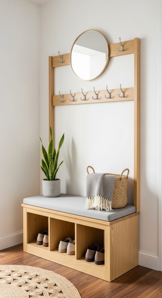 A hall tree is a compact, all-in-one furniture piece that works perfectly in a small front entryway. It typically combines hooks, a bench, and cubbies for storage, offering maximum utility in minimal space. Choose a slim version to avoid overwhelming the area. A hall tree keeps coats, shoes, and bags tidy, while providing a spot to sit and stay organized. To soften the look, style it with a small cushion, plants, or a decorative throw. This functional solution ensures even the tiniest entryways feel neat and welcoming.