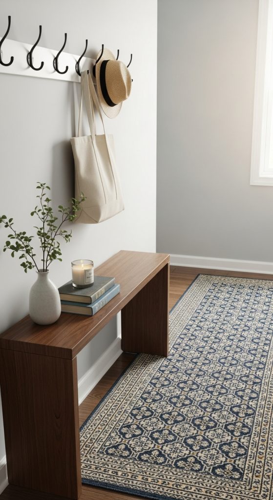Adding a rug or runner instantly defines a small front entryway, giving it warmth and style. Choose a durable, washable rug in a bold pattern or neutral tones depending on your style. Rugs protect floors from dirt and add comfort underfoot, especially in high-traffic areas. In small spaces, a runner helps elongate the area visually, making it appear larger. Pairing a rug with simple hooks or a small console table makes the space feel cohesive and polished while still being functional and easy to maintain.