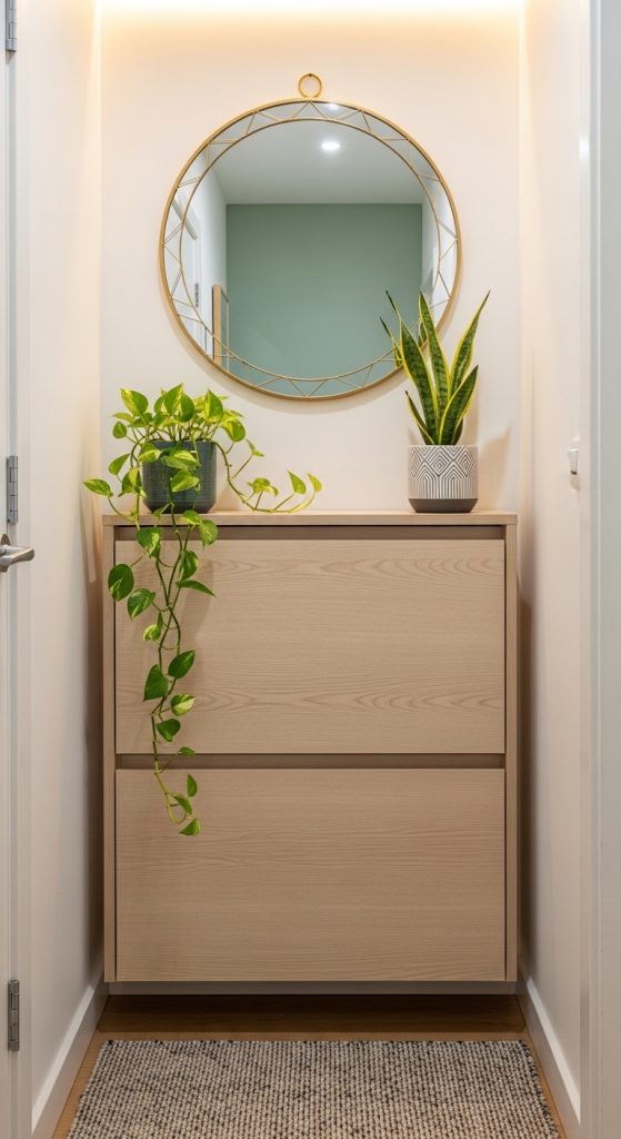 Shoes often create clutter in entryways, so a compact shoe storage cabinet is a great small-space solution. Slim cabinets with pull-out drawers save space while keeping footwear organized and out of sight. Some cabinets even double as a small shelf on top for keys or décor. Choose a sleek design in white, wood, or black for a modern look. Pairing it with a small mirror or wall hooks completes the setup, ensuring a tidy and stylish entryway. It’s practical, space-saving, and perfect for small homes.