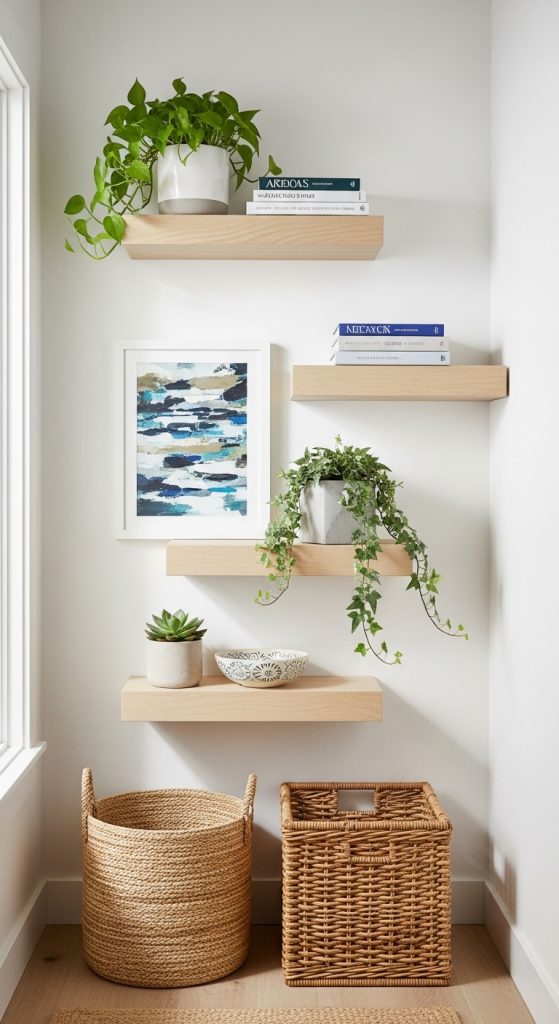 Floating shelves can transform a small entryway into a practical yet stylish nook. Install a set of shelves above shoe storage baskets for a layered effect. The baskets help hide clutter while the shelves can hold decorative items, mail, or even small plants. Floating designs save floor space and keep the area feeling open. For a cohesive look, choose baskets in natural textures like wicker or seagrass. This design balances functionality with charm, giving a small entryway both storage and personality.