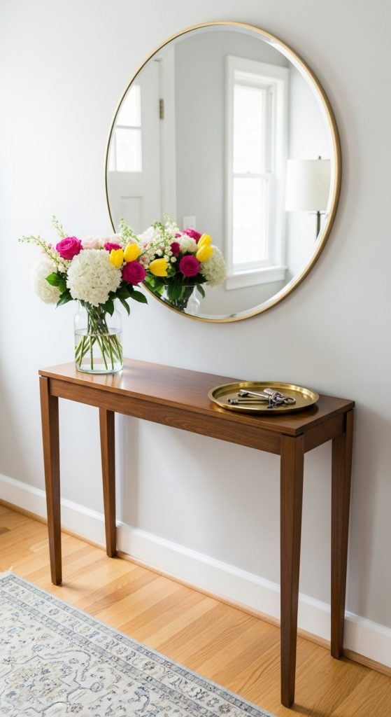 A slim console table paired with a stylish mirror is a timeless solution for small front entryways. The table provides space to place keys, mail, or decorative accents like candles and vases, while the mirror helps the area appear larger and reflects light. Opt for a floating console or one with open legs to keep the space airy. Adding a decorative bowl or tray ensures small items stay organized. This setup blends practicality with elegance, offering both function and beauty in a narrow space.