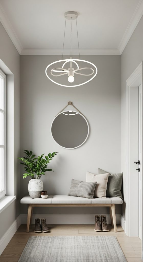 A statement light fixture can instantly elevate a small entryway, making it feel intentional and inviting. Choose a pendant light, chandelier, or wall sconces that reflect your home’s style. Even in compact areas, lighting has the power to set the mood and make the space memorable. Pair the fixture with neutral paint or light-colored walls to enhance brightness. Decorative lighting not only makes the entryway more stylish but also improves functionality by ensuring the area is well-lit. This idea proves that even the smallest entryways can feel luxurious.